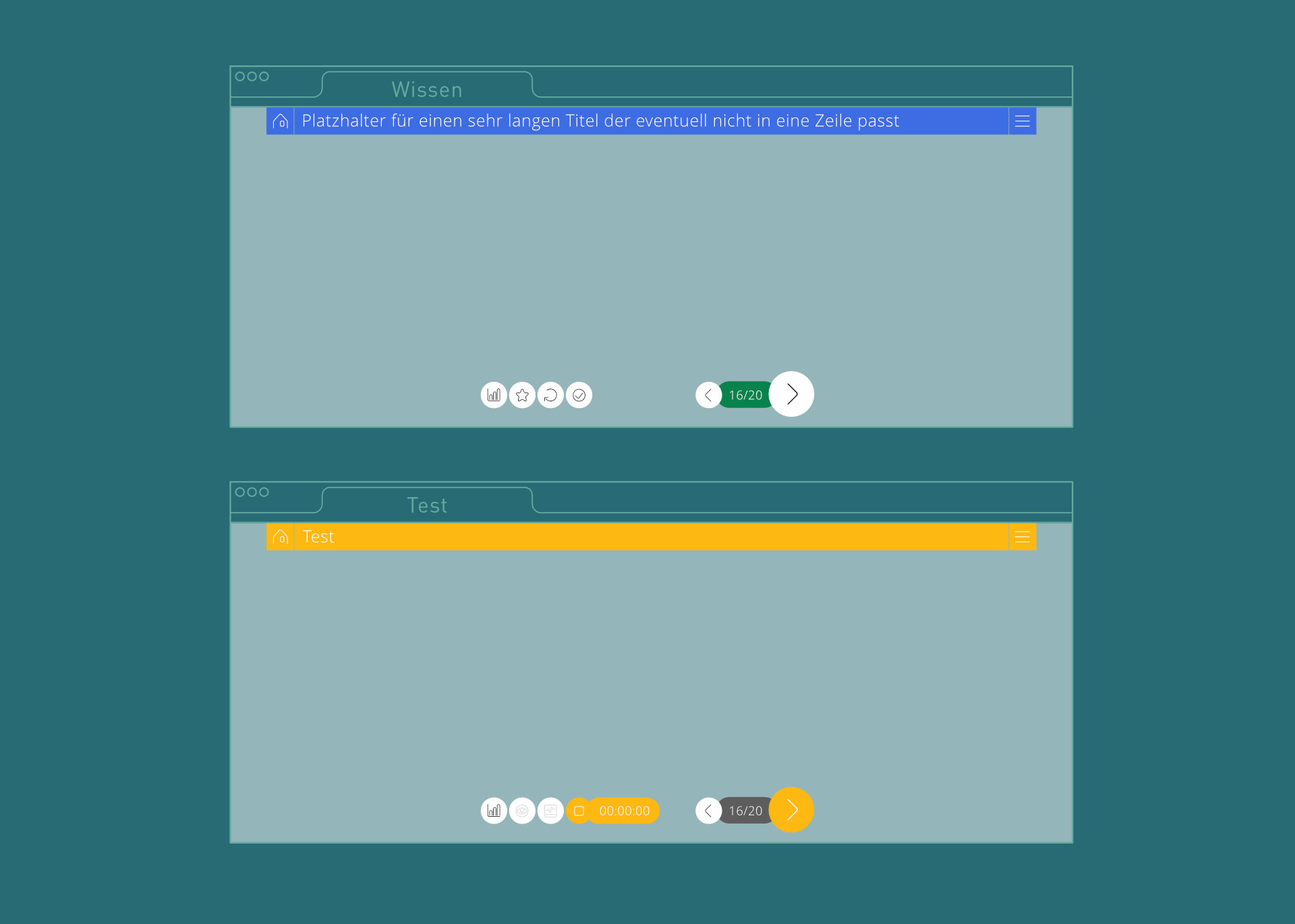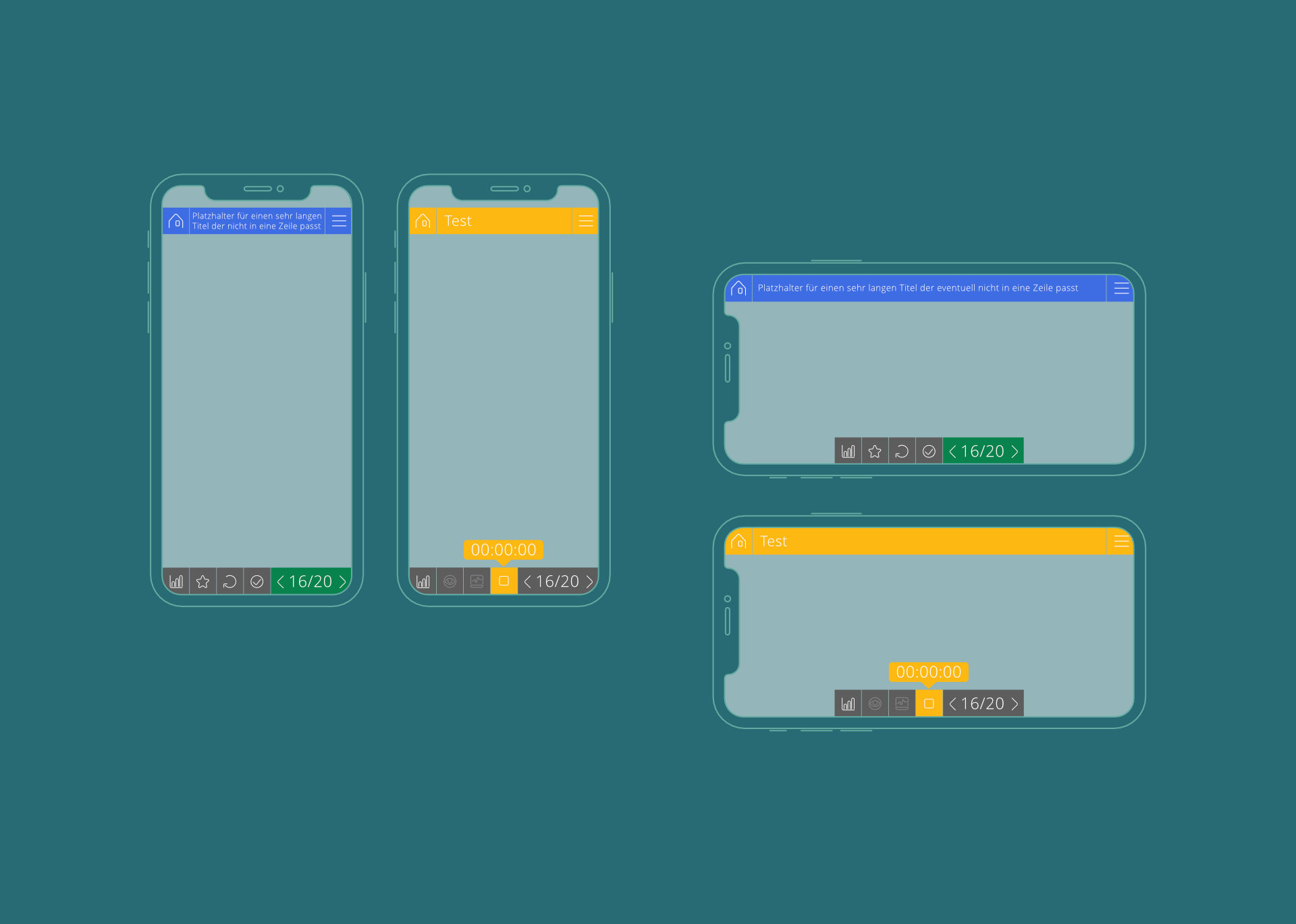 In einer dritten Stufe löse ich mich von der quadratischen Form der Button. Die Kreisform lässt bei gleichem Bedienkomfort die Buttonsets leichter und luftiger erscheinen. In der Seitennavigation überlagern sich die Button mit dem Seitenindikator und verschmelzen so zu einer Einheit. Der Vor-Button wird durch die Größe zum primären Bedienelement. In der Testansicht vermittelt die Überschneidung des Stop-Button mit der Zeitanzeige dem Benutzer unmißverständlich dessen Funktionszugehörigkeit. Mit Fingergesten können an mobilen Geräten bequem Elemente (Header, Auswertungsbutton) aus- und eingeblendet werden.
