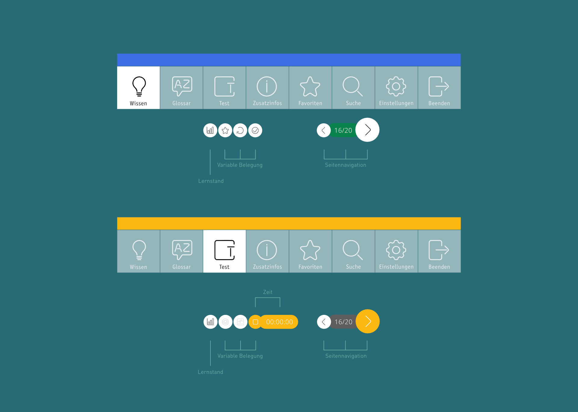 Eine Abkehr vom Prinzip der bildschirmbreiten Button ermöglicht es, die Button zu komprimierten. Werden die Button nach Funktionen geordnet, lassen sich Funktionseinheiten bilden. Die Seitennavigation befindet sich in der Desktopansicht rechts und besteht aus Seitenindikator umrahmt von Vor- und Zurückbutton. Die Button für Lernstand, Analyse und Auswertung bilden eine Funktionseinheit am linken Rand. In der Testmodusansicht erscheint jetzt unmittelbar neben der Zeitanzeige der Stop-Button. Durch das Neuordnen der Button lassen sich Bedienfehler vermeiden und die Mauswege werden kürzer.